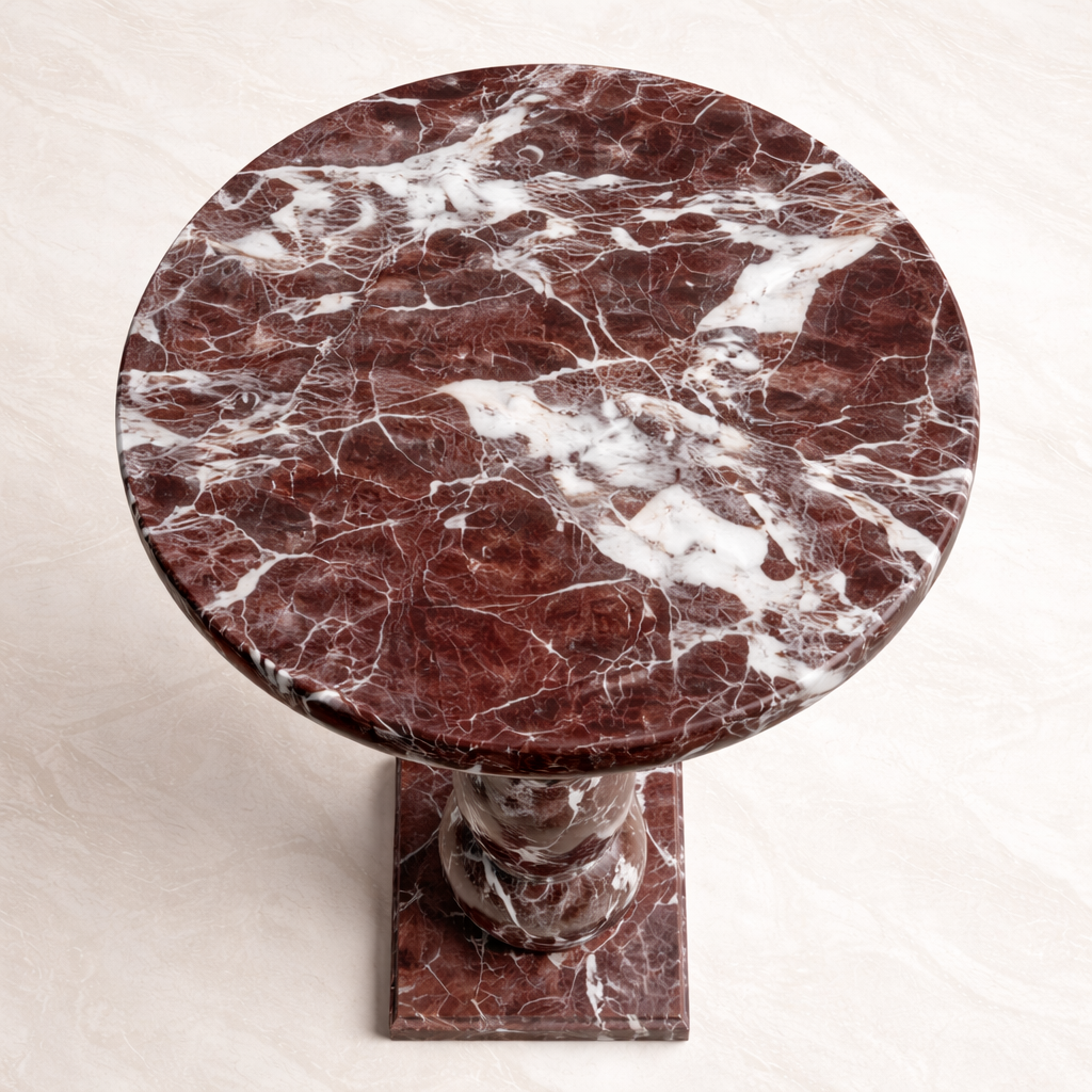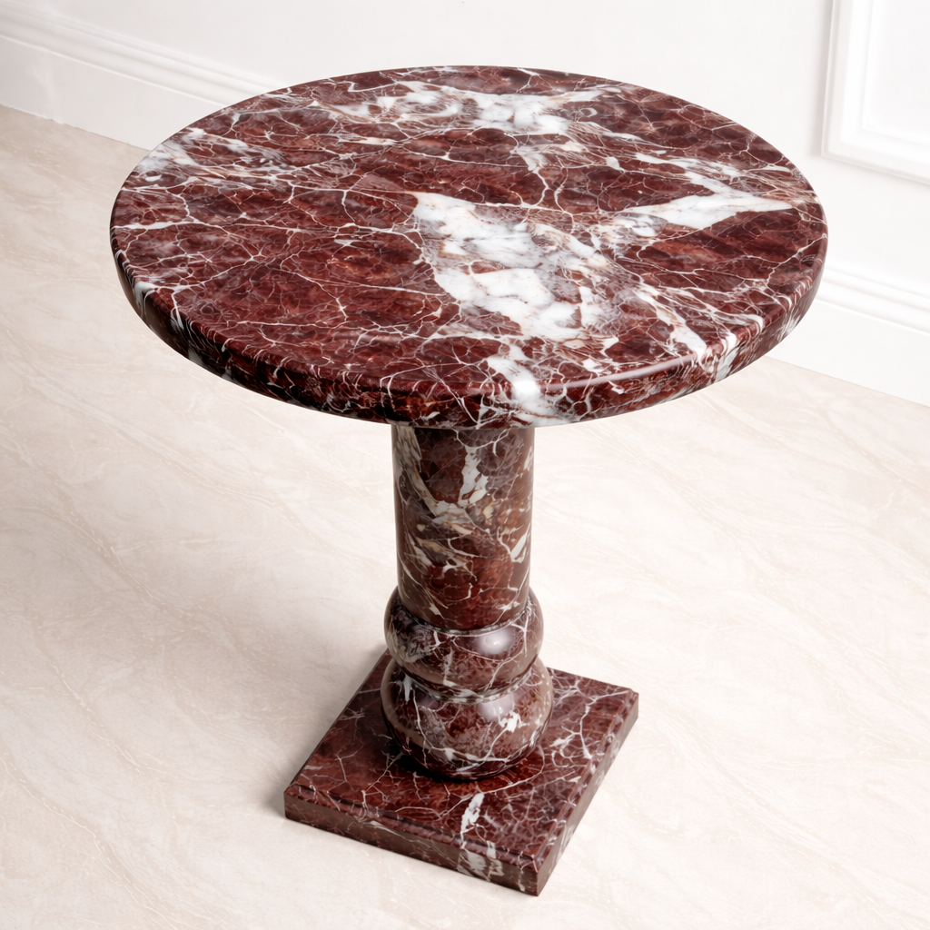This Rosso Levanto Marble Round Table is a refined expression of natural stone craftsmanship. Handcrafted from genuine Rosso Levanto marble, it features deep red hues accented by organic white veining, giving each table its own distinct character.